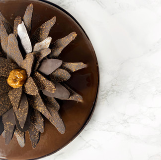 - Saupoudrer de cacao en poudre sur la fleur en chocolat. - Disposer la fleur en chocolat au centre du gâteau.